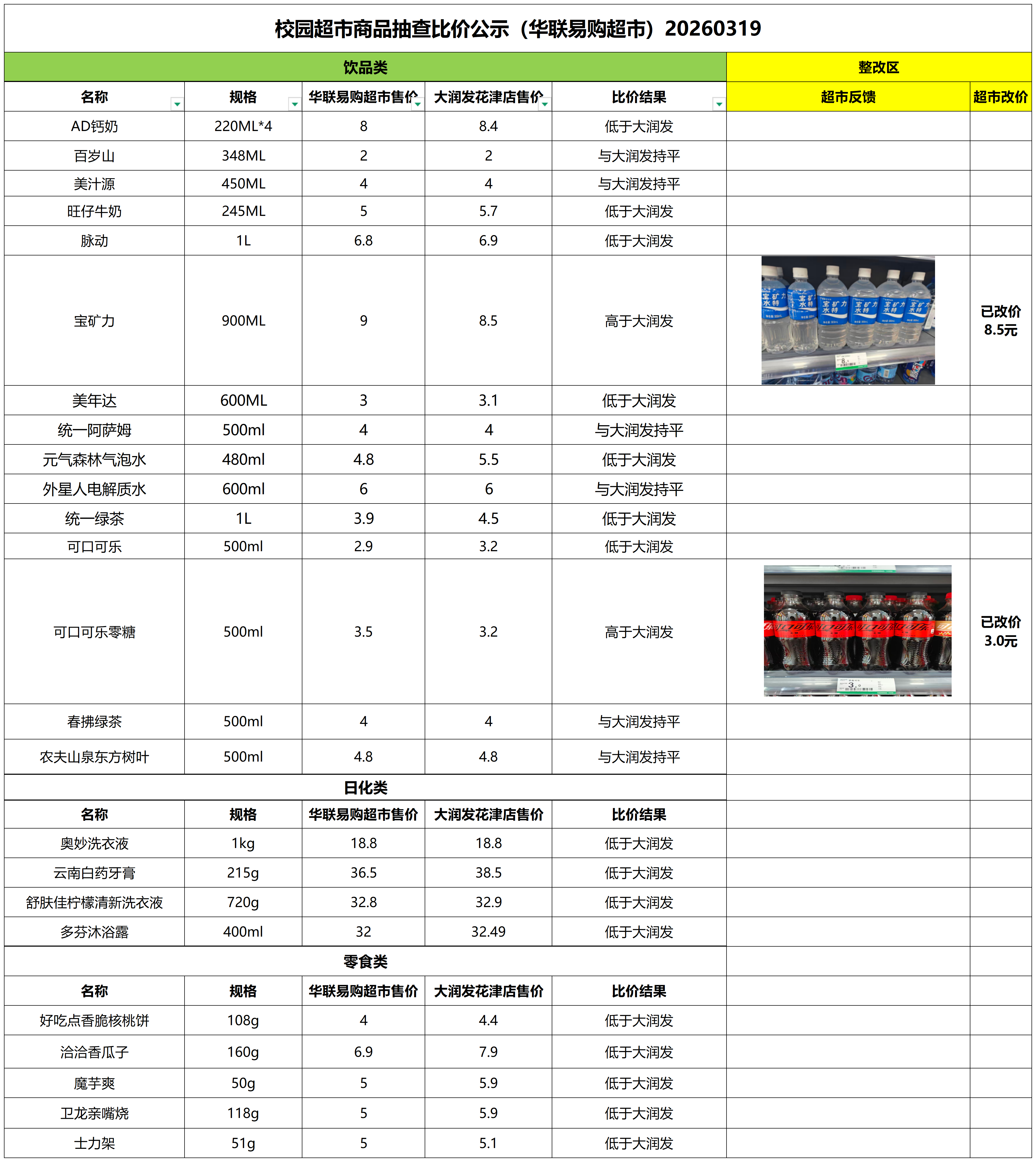 3月第3周校园超市比价结果公示